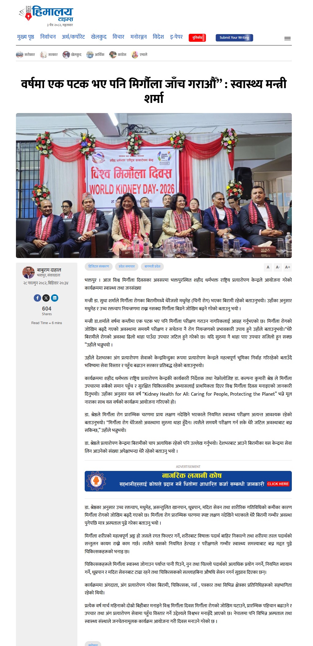 वर्षमा एक पटक भए पनि मिर्गौला जाँच गराऔँ” स् स्वास्थ्य मन्त्री शर्मा |