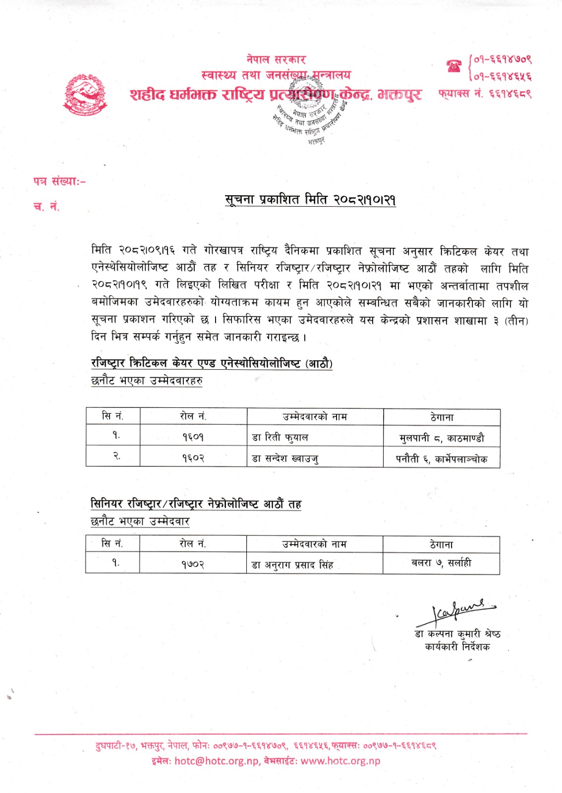 सिनियर रजिष्ट्रार / रजिष्ट्रार नेफ्रोलोजिष्ट (आठौ)अन्तर्वाताको नतिजा |